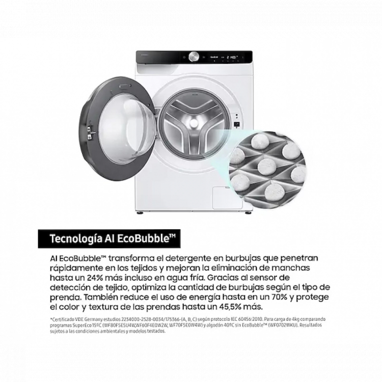 | Tecnologías Samsung (cuidado de la ropa) | Control de IA, AI EcoBubble, AI Wash, BubbleSoak™, Drum Clean+, SmartThings, StayClean Drawer, Super Speed |