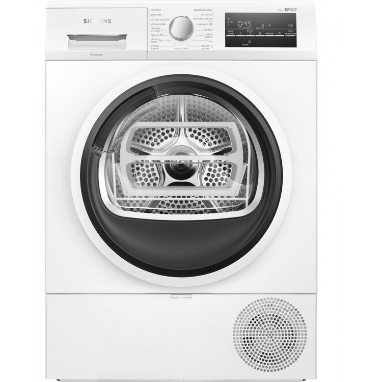 - Secadoras con bomba de calor - IQ500 - SIEMENS, WT45RT00ES, Secadora, Bomba de calor, A++, Libre instalación, 60 cm., 9 kg , Blanco, Display LED, filtro de fácil limpieza, cesto, iluminación interior, tambor acero inoxidable, puerta cristal, conexión a desagüe, instalación bajo encimera en mueble de altura min. 85 cm. Pausa+Carga