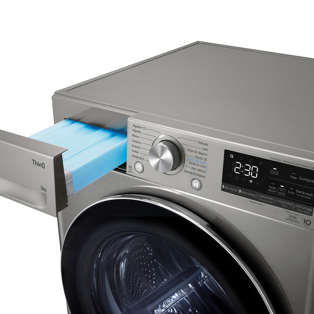 DUAL INVERTER HEAT PUMP?¢ (BOMBA DE CALOR DUAL INVERTER): PROPORCIONA UN SECADO CON LA MáXIMA EFICIENCIA ENERGéTICA EN EL MENOR TIEMPO POSIBLE.ECO HYBRID?¢: TE PERMITE SELECCIONAR AHORRAR ENERGíA O TIEMPO SEGúN TUS NECESIDADESSPRAY DE AGUA:LIMPIEZA AUTOMáTICA DEL CONDENSADOR MEDIANTE UN SPRAY DE AGUA A PRESIóNPUERTA REVERSIBLE: ADAPTADA A TUS NECESIDADES DE ESPACIOFICHA TÉCNICACARACTERíSTICAS PRINCIPALES:CAPACIDAD:9KGCOLOR EXTERIOR:INOX ANTIHUELLASBOMBA DE CALOR:DUAL INVERTER GARANTíA:10 AñOS EN BOMBA DE CALOR Y MOTOREFCIENCIA ENERGéTICA:A+++ (ESCALA A+++ A D)CARACTERíSTICAS GENERALES:GAS REFRIGERANTE:R290CONSUMO ENERGéTICO:194 KWH/AñOCONDENSACIóN GRADO:ANIVEL SONORO:62DBDISPLAY:GRAN LEDPUERTA DE CRISTAL ANTI ARAñAZOS:SíAUTOLIMPIEZA DEL CONDENSADOR:SITAMBOR:ACERO INOXIDABLESISTEMA DE SECADO INVERTER:SíDIMENSIONES:DIMENSIONES (ANCHO X ALTO X FONDO):600×850×660ACCESORIOS:TUBO DE DESAGüE:SICESTO DE SECADO:SIFUNCIONES ADICIONALES:DESCARGA DE PROGRAMAS:SIANTI ARRUGAS:SILUZ DEL TAMBOR:SIINICIO REMOTO:SINIVELES DE SECADO:PLANCHA:SIARMARIO:SIEXTRA:SIPUERTA REVERSIBLE:SI