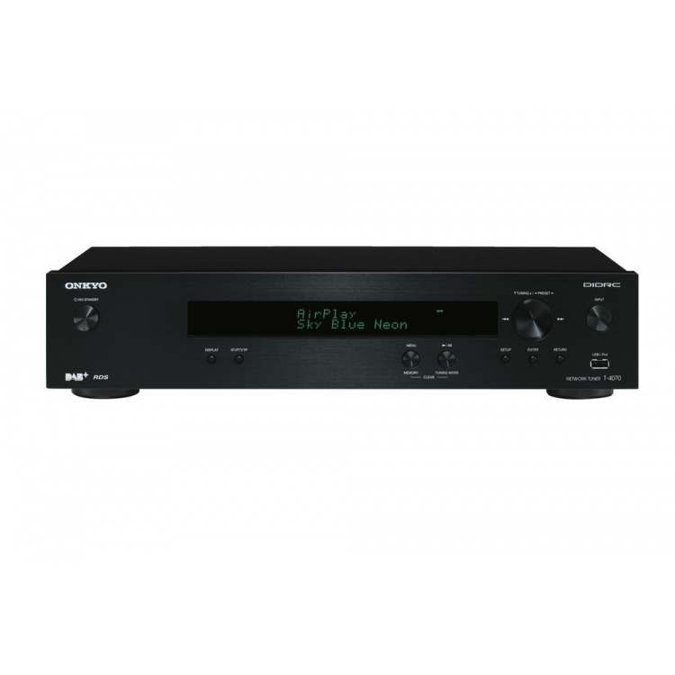 El sintonizador de red T-4070 de Onkyo, compatible con AirPlay, está preparado para la revolución multimedia. Conecte el T-4070 a su red doméstica para acceder a servicios de transmisión basados en la nube, radio por Internet y bibliotecas musicales en varios formatos de PC. Transmita audio de forma inalámbrica desde su dispositivo iOS o su PC con AirPlay, o bien disfrute de la música almacenada en el iPod, el iPhone o un dispositivo de memoria flash mediante el puerto USB de conexión digital directa. Evidentemente, también puede seleccionar cualquiera de las emisoras de radio AM/FM/DAB/DAB+ disponibles. Controlar toda esta música no podría ser más sencillo: la aplicación remota de Onkyo para iPod touch/iPhone y teléfonos Android le coloca el control del T-4070 en la palma de la mano. Sea cual sea el modo de escucha que elija, le sorprenderá la excelente calidad del sonido. El sistema de circuitos DIDRC y los DAC de 192 kHz/24 bits Wolfson® de cada canal, integrados en una carcasa antivibraciones de 1,6 mm de grosor, ofrecen un procesamiento extremadamente preciso con calidad de audiófilo. Combinado con uno de los sistemas hi-fi de la serie de referencia de Onkyo o con su sistema estéreo existente, el T-4070 revitalizará a la banda sonora de su vida.