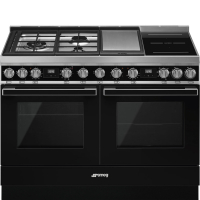 Cocinas 120cm 2 cavidades SMEG CPF120IGMPBL. Cocina Portofino 120 cm, color Negro, dos hornos de 60 cm, Horno 1: Termoventilado y Pirolítico, Horno 2: Termoventilado, Vapor Clean, Encimera mixta, 3 zonas de gas, 1 teppanyaki, 1 mulizona inducción.