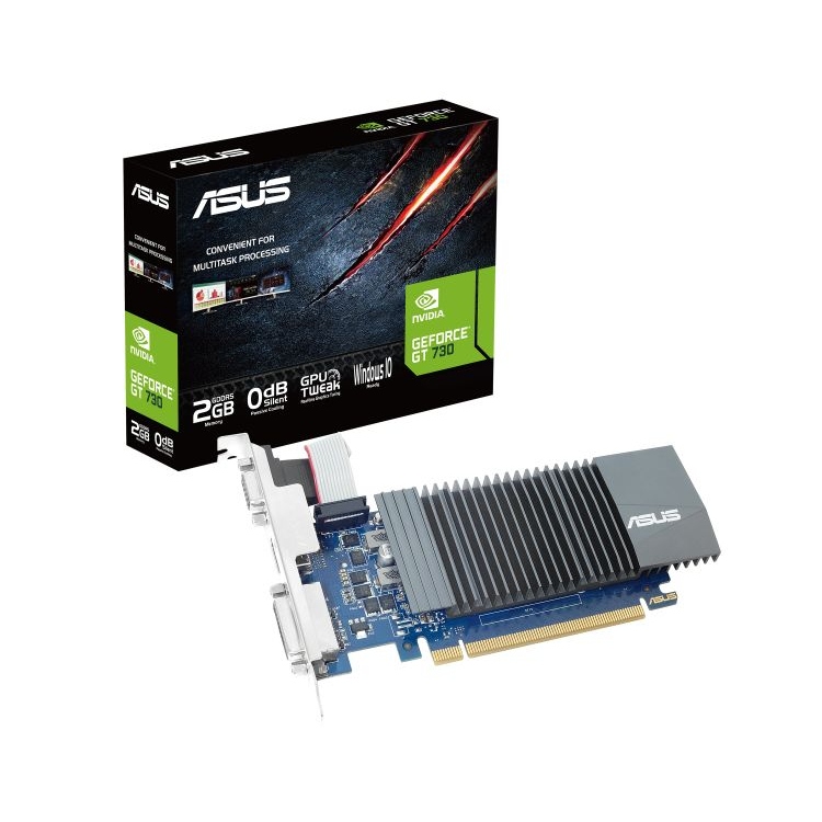 Características:. . El nuevo perfil de frecuencia de reloj de la GPU permite un 17 % menos de consumo de energía . . El enfriamiento pasivo silencioso significa 0dB verdaderos, perfecto para PC silenciosas de cine en casa y centros multimedia.. La tecnología Auto-Extreme utiliza la automatización para mejorar la confiabilidad.. Admite 3 pantallas : conecta hasta 3 monitores para una multitarea mejorada.. GPU Tweak II proporciona ajustes de rendimiento intuitivos, controles térmicos y monitoreo del sistema.. . Gran productividad en un paquete pequeño. La ASUS GeForce® GT 730 es una tarjeta gráfica de una sola ranura con refrigeración pasiva que permite una productividad silenciosa en varios monitores. . Enfriamiento Pasivo. Un diseño de refrigeración pasiva crea un espacio de trabajo más silencioso.. . Eficiencia Energética Impulsada. Reduce el consumo de energía. La última versión de ASUS GeForce® GT 730 presenta un perfil de frecuencia de reloj de GPU revisado que reduce el consumo de energía en un 17 %, lo que la convierte en la tarjeta gráfica ideal para equipos ultracompactos y HTPC de bajo ruido.. . Diseño de una sola ranura. tanto espacio. Un diseño compacto de una sola ranura aumenta la compatibilidad con otros periféricos PCIe e incluso permite apilar varias tarjetas ASUS GeForce GT 730 en un sistema.. . Admite 3 pantallas. ASUS GeForce GT 730 es una tarjeta gráfica compacta con tres salidas (HDMI, DVI y D-Sub) que puede admitir hasta tres pantallas al mismo tiempo para realizar varias tareas a la vez.. . Especificaciones:. . Graphic Engine: NVIDIA® GeForce GT 730. Bus Standard: PCI Express 2.0. OpenGL: OpenGL®4.6. Video Memory: 2GB GDDR5. Engine Clock: OC mode: 732 MHz / Gaming mode: 706 MHz. CUDA Core: 384. Memory Speed: 5010 MHz. Memory Interface: 64-bit. Resolution: Digital Max Resolution 3840 x 2160. Interface:. Yes x 1 (Single-link DVI-D). Yes x 1 (D-Sub). Yes x 1 (Native HDMI 1.4b). HDCP Support Yes (2.2). Maximum Display Support: 3. NVlink/ Crossfire Support: No. Dimensions: 167 x 69 x 17 mm. Recommended PSU: 300W. Slot: 1 Slot